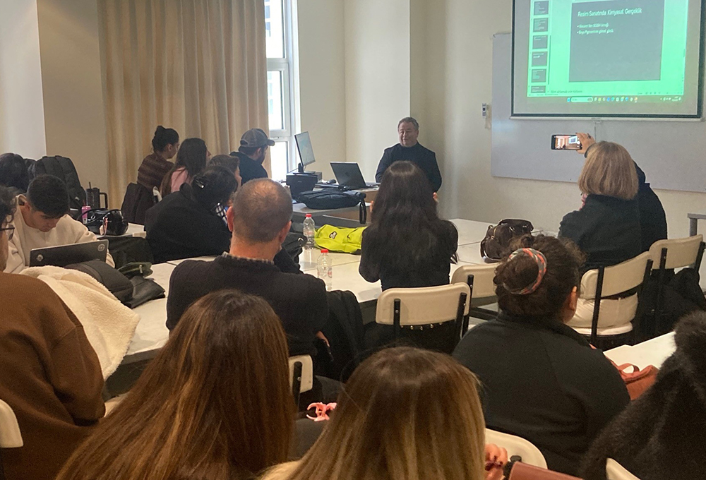 İletişim ve Tasarımı Bölümü öğrencileri, 9 Aralık Salı günü Güzel Sanatlar Uygulama ve Araştırma Merkezi (GSUAM) tarafından düzenlenen "Resim Sanatında Profesyonellik ve Sanatçı Duyarlılığı" adlı söyleşiye konuk oldu. Sanat ve Tasarım Fakültesi Dekanımız Prof. Dr. Mehmet Üstünipek’in de katılımıyla gerçekleştirilen etkinlikte konuşan Prof. İhsan Doğrusöz, kişisel deneyimlerinden yola çıkarak sanat üretiminde karşılaşılan zorlukları ve mesleki tecrübelerini aktardı. Doğrusöz ayrıca, resim sanatı başta olmak üzere tüm sanat dallarındaki eserlerin Türkiye ve dünyada izleyiciyle buluşma stratejileri ve metotları hakkındaki görüşlerini öğrencilerle paylaştı.
